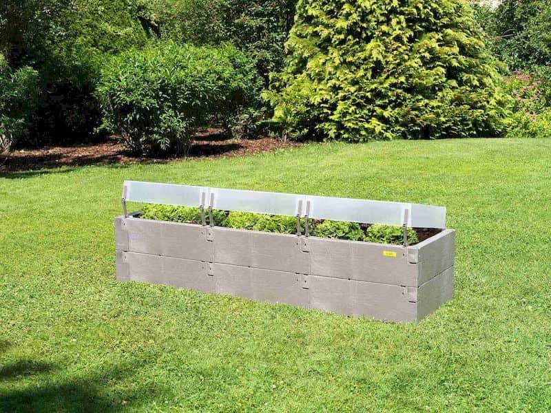 Vyvýšený záhon JUWEL TIMBER XXL Vám rozšíří zahradní sezónu. Záhon tvoří zídka ze dvou vrstev plastových „kamenů“. Vrcholek záhonu je ochráněn průsvitným polypropylénovým krytem, který poskytuje výsadbě ochranu před nepříznivým počasím (povětrnostní vlivy, krupobití).