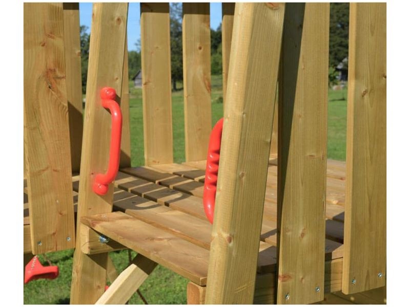 Hrací věž je vyrobena z odolného severského borovicového dřeva, které zaručuje dlouhou životnost a bezpečnost pro vaše děti. Veškeré použité materiály splňují přísné bezpečnostní normy, což potvrzuje certifikát FSC-Mix 70 % a EN71. Nosnost věže je 100 kg.