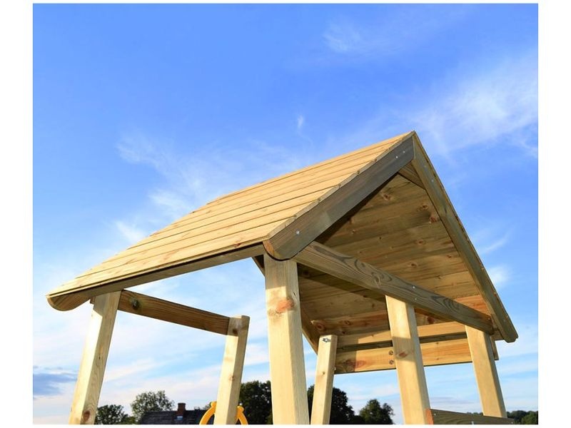 Hrací věž je vybavena skluzavkou, ke které vede žebřík i lezecká stěna. Vaše dítě si může ve věži vytvořit tajnou skrýš nebo se zapojit do různých kreativních her. Mimo jiné si děti mohou užít spoustu zábavy na houpačce. Pod věží se nachází plocha pro hraní i za mírného deště.