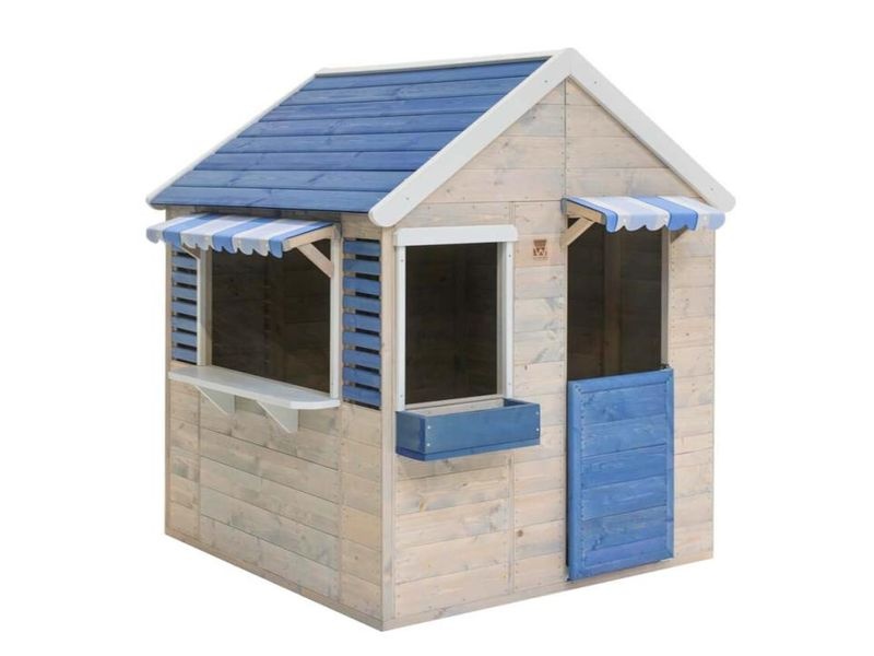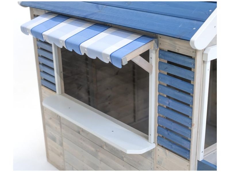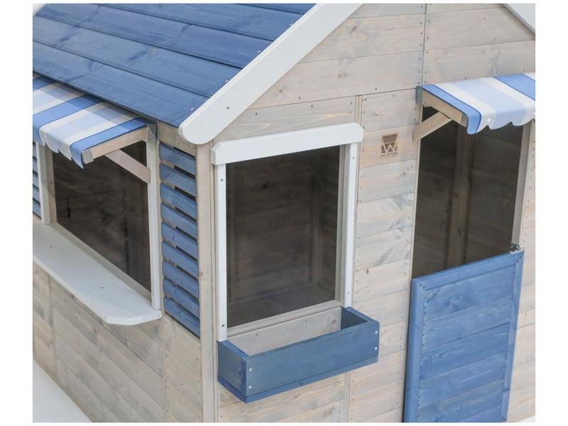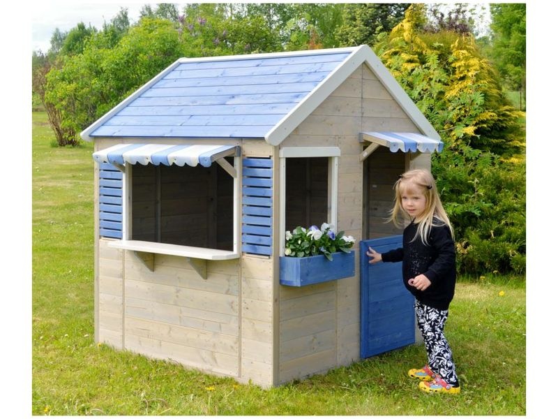 Domeček na hraní zaujme svým přirozeným vzhledem z borovicového dřeva. Jedno okno s květinovým boxem a druhé okno s pruhovanou markýzou dodávají domečku jedinečný a přitažlivý vzhled, který okouzlí jak děti, tak i dospělé.