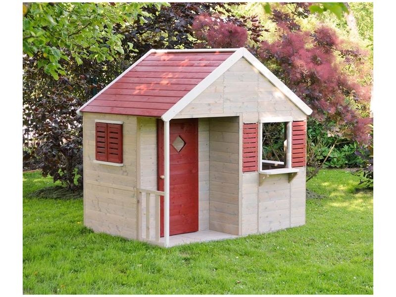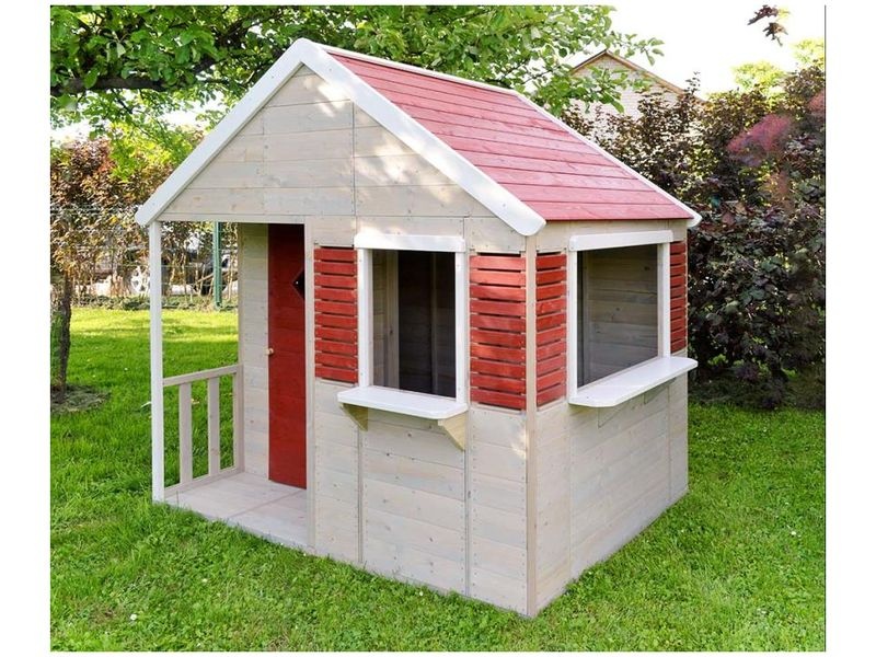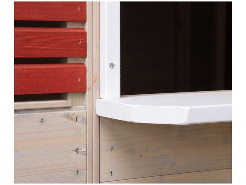 Domeček na hraní zaujme svým přirozeným vzhledem z borovicového dřeva. Jedno okno s květinovým boxem a druhé okno s pruhovanou markýzou dodávají domečku jedinečný a přitažlivý vzhled, který děti okouzlí.