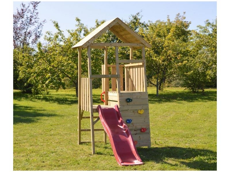 Hrací věž je vybavena skluzavkou, ke které vede žebřík i lezecká stěna. Vaše dítě si může v domečku vytvořit tajnou skrýš nebo se zapojit do různých kreativních her. Mimo jiné si děti mohou užít spoustu zábavy na vestavěném pódiu.