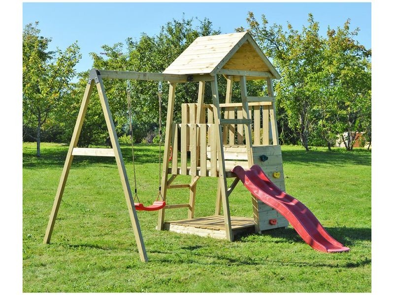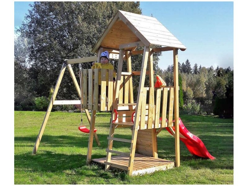 Hrací věž je vybavena skluzavkou, ke které vede žebřík i lezecká stěna. Vaše dítě si může v domečku vytvořit tajnou skrýš nebo se zapojit do různých kreativních her. Mimo jiné si děti mohou užít spoustu zábavy na houpačce.