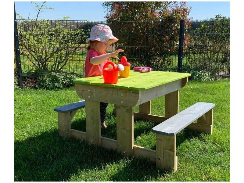 Sedací souprava s rozměry 80×100×53 cm je praktickým a zábavným doplňkem do vaší zahrady. Součástí jsou pod poklopem dvě vyjímatelné hrací nádoby, což dětem poskytne skvělé možnosti pro hraní. Lavice jsou ke stolku pevně připevněny. Je ideálním místem pro dobrodružství a kreativní hru, která vaše děti potěší a zabaví.