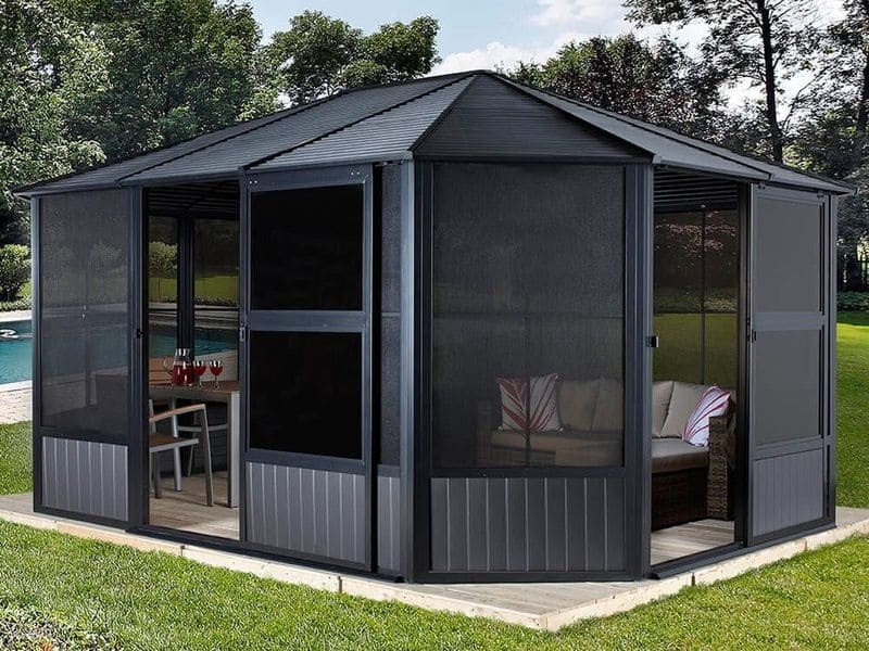 Součástí altánu jsou také posuvné dveře. Ty lze flexibilně namontovat ze všech stran. Upozorňujeme, že na každou stranu lze namontovat pouze jedny dveře.