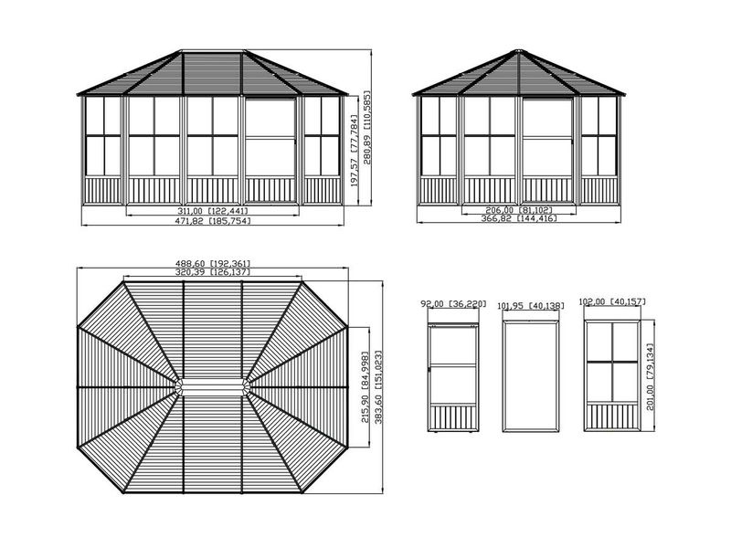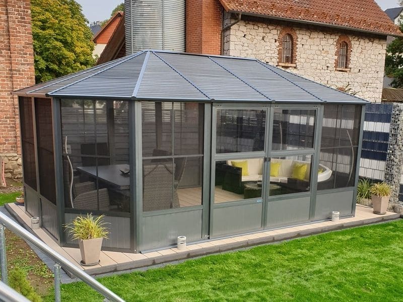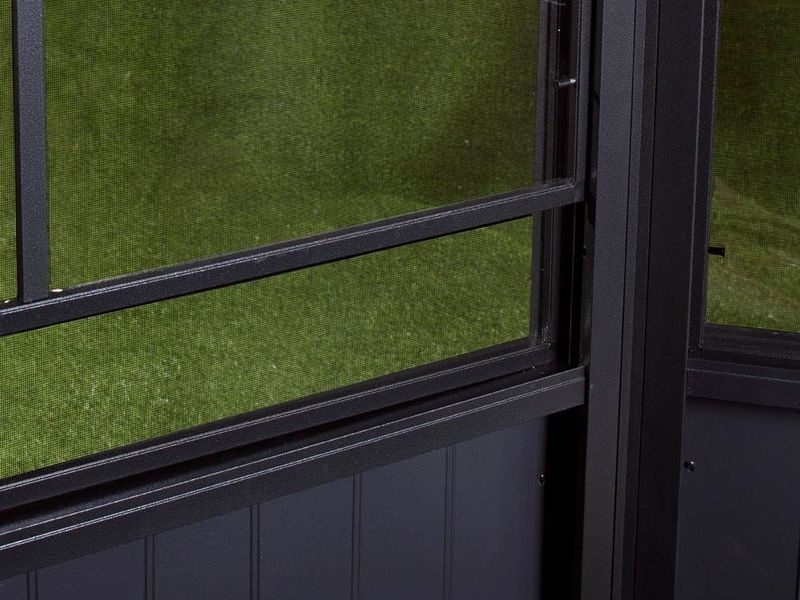 Větrání a průchod světla je umožněn pomocí 12 oken, jedno v každém stěnovém prvku (š. 94 × v. 74 cm). Každé z nich se skládá z moskytiéry a okna z PVC fólie odolné proti roztržení, které se pro větrání jednoduše zasune a pro čištění se ve dvou jednoduchých krocích odstraní. Můžete se tak těšit výhledem na svou zazhradu, přestože prší, a užít si tak chvíli klidu a pohody.