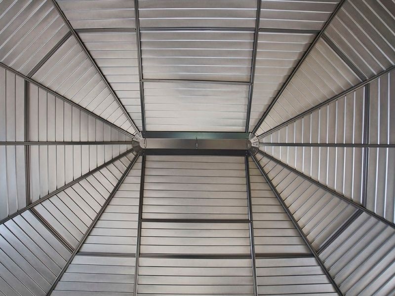 Střecha altánu je vyrobena z kvalitní pozinkované oceli. Zaručuje obzvláště vysokou stabilitu a snadno odolává povětrnostním podmínkám, jako je déšť, sníh nebo slunce. Díky tomu je možné altán nechat na svém místě po celý rok.
