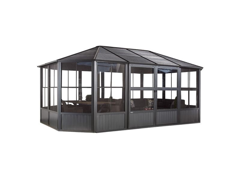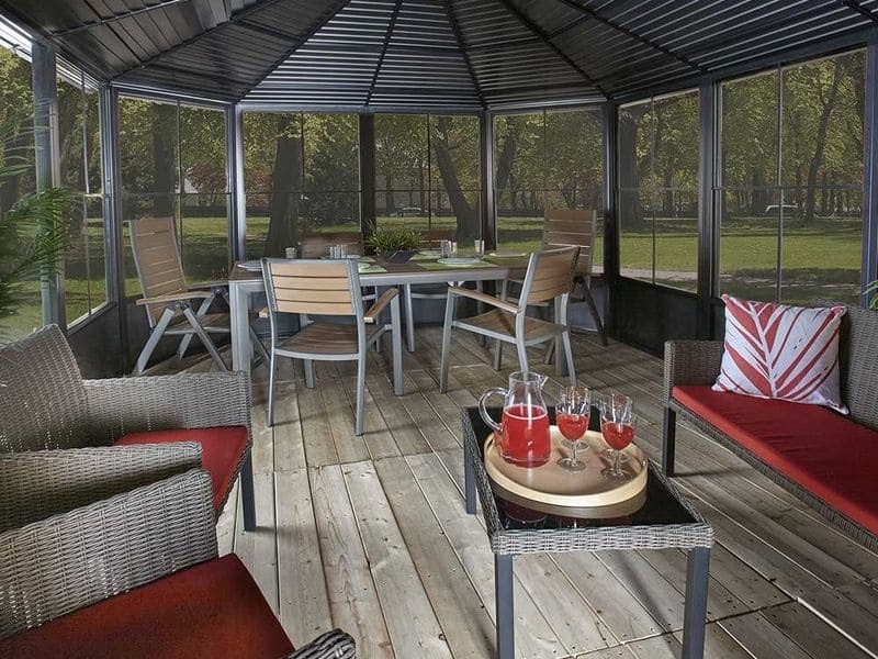 Altán nemá skleněnou ani plastovou výplň oken. Výrobce zasklení pro tento model nevyrábí. Altán je ze své podstaty lehká a vzdušná zahradní stavba, která nemá zasklené stěny ani okenní výplně. Součástí balení jsou však moskytiéry proti komárům.