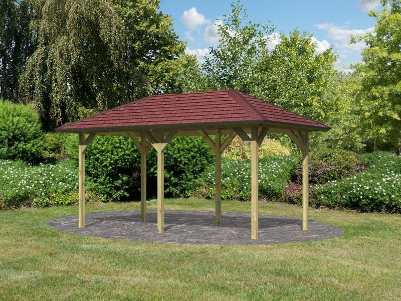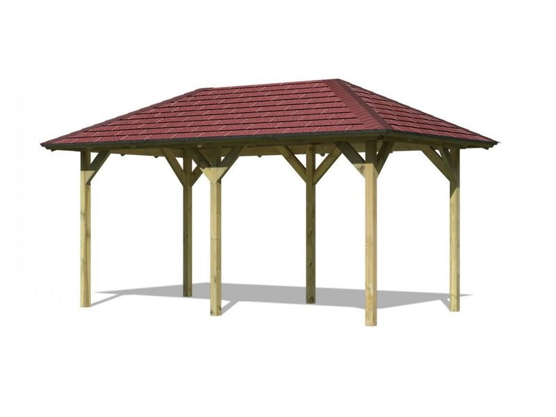 Nepřehlédněte: Vzhledem k velkým plochám střechy a zatížení větrem je nutné připevnit altán k zemi pomocí H kotev v délce cca 60 cm, které NEJSOU obsahem základního balení. Dražší set obsahuje obdélníkový, tmavě červený střešní šindel pro celou střechu altánu.