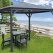 Zahradní hliníkový altán poskytuje potřebný stín pro posezení na zahradě. Nejedná se o běžný lehký altán s trubkovou skládací konstrukcí (jaké jsou běžně k dostání v hobbymarketech), ale o masivní přístřešek zhotovený ze silných, vzájemně sešroubovaných hliníkových profilů (síla 1,0 mm) určených k pevné montáži k zemi pomocí patek.