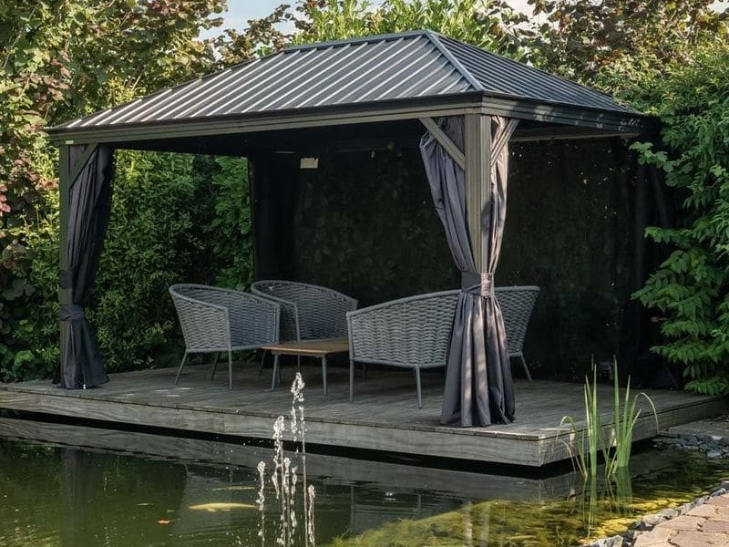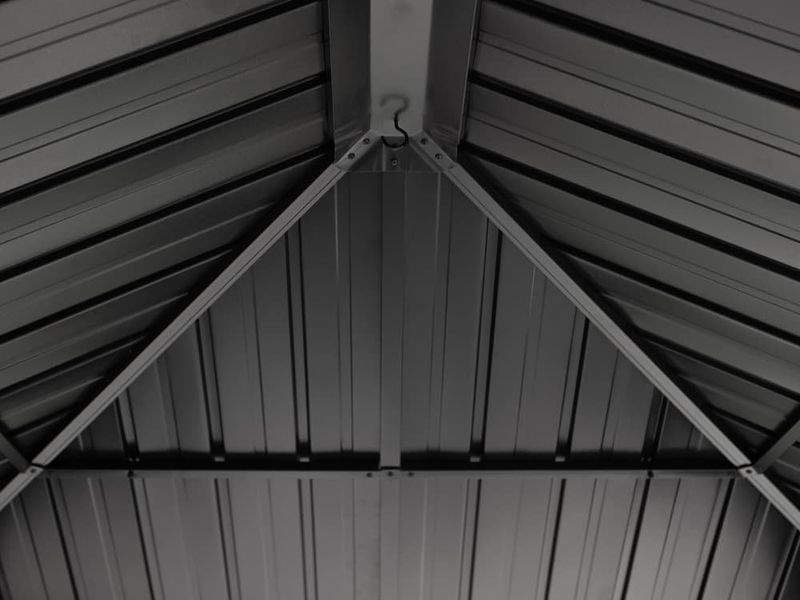 Střecha altánu je vyrobena z odolné oceli, která je vždy krásně tvarovaná. Zaručuje obzvláště vysokou stabilitu a snadno odolává povětrnostním podmínkám, jako je déšť, sníh nebo slunce (UV záření). Díky tomu je možné altán nechat na svém místě po celý rok. Součástí jsou také dešťové žlaby, které umožňují odtok dešťové vody.