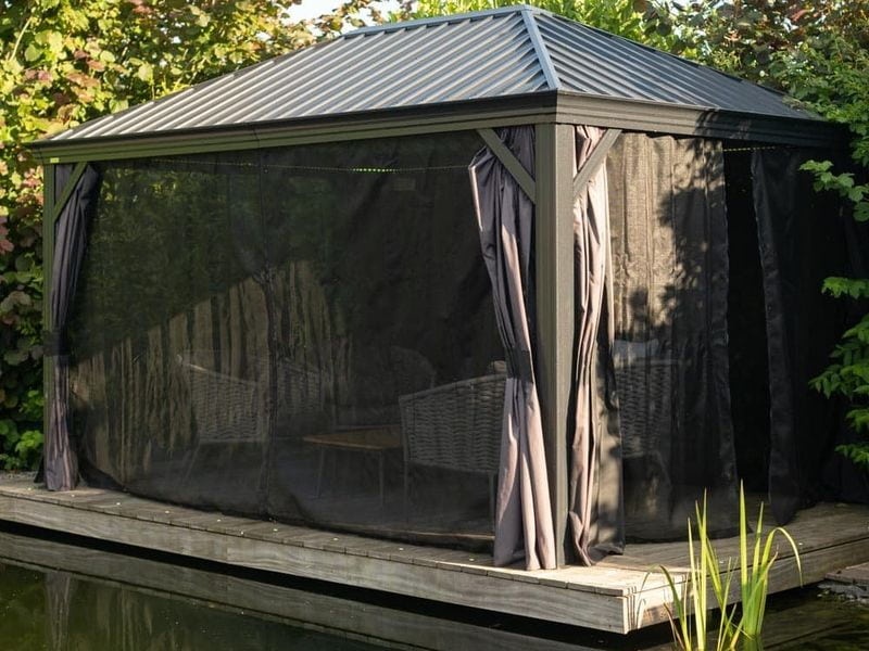 Součástí altánu jsou nylonové moskytiéry. Je možné dokoupit polyesterové závěsy. Oboje lze díky systému dvojitých kolejnic připevnit k sobě. Na rozdíl od jiných modelů se nejedná o jedno nebo druhé, ale moskytiéru i závěsy lze používat současně.