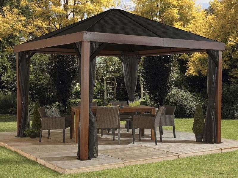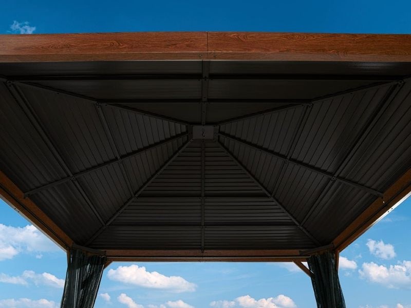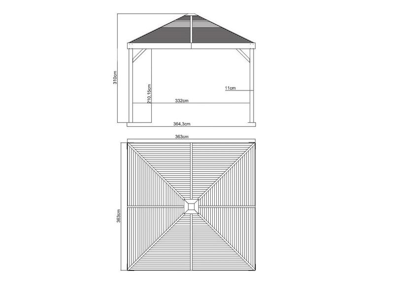 Střecha altánu je vyrobena z odolné pozinkované oceli, která je vždy krásně tvarovaná. Zaručuje obzvláště vysokou stabilitu a snadno odolává povětrnostním podmínkám, jako je déšť, sníh nebo slunce (UV záření). Díky tomu je možné altán nechat na svém místě po celý rok.