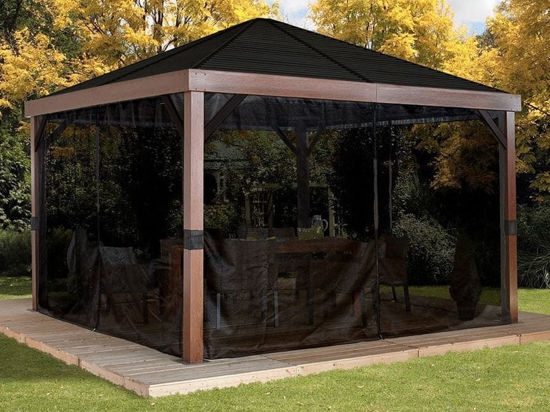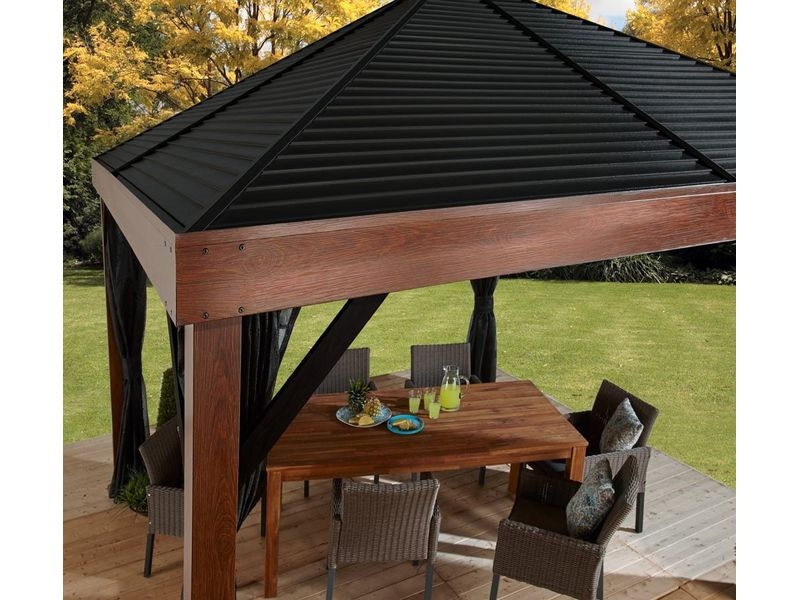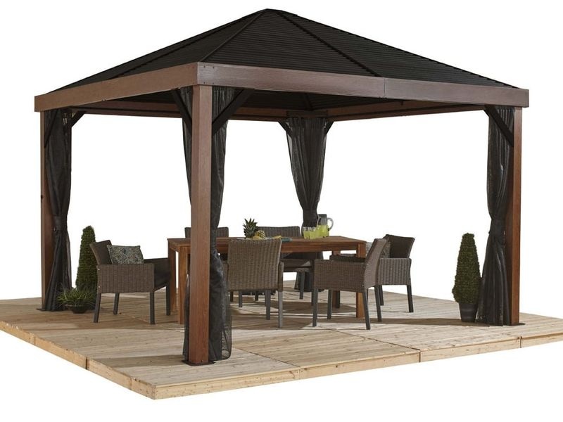 Hliníkový altán vám vytvoří příjemné místo pro odpočinek hned vedle vašeho domu nebo kdekoliv na zahradě. Je opatřen moskytiérou, která vás během vlahých letních večerů ochrání před komáry. Dřevěný vzhled altánu zútulní vaši zahradu.