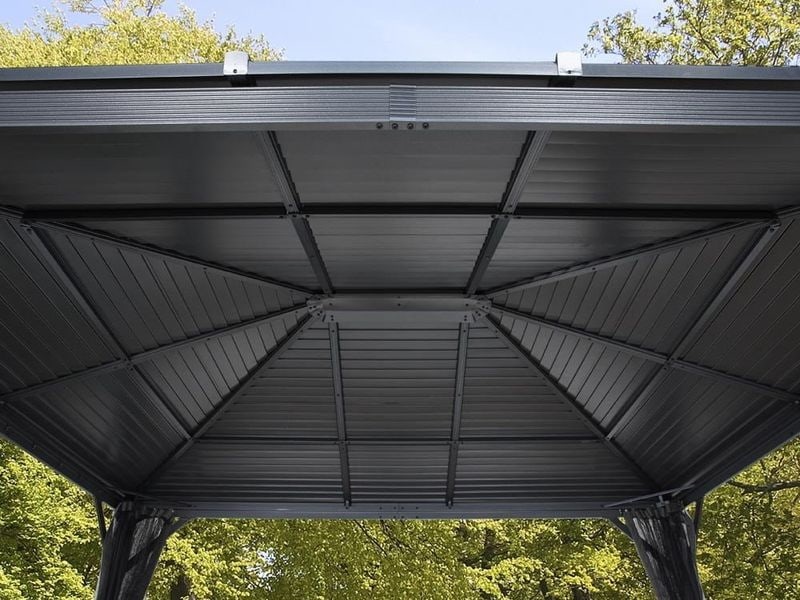 Střecha altánu je vyrobena z odolné pozinkované oceli, která je vždy krásně tvarovaná. Zaručuje obzvláště vysokou stabilitu a snadno odolává povětrnostním podmínkám, jako je déšť, sníh nebo slunce. Díky tomu je možné altán nechat na svém místě po celý rok.