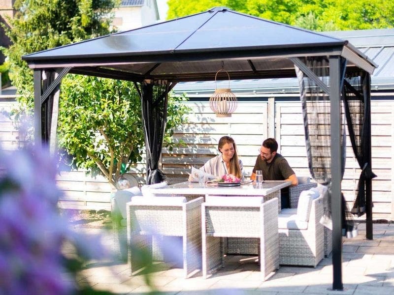 Střecha altánu je vyrobena z dvojitých lamel o tloušťce 6 mm. Zaručuje obzvláště vysokou stabilitu a snadno odolává povětrnostním podmínkám, jako je déšť, sníh nebo slunce (UV záření). Díky tomu je možné altán nechat na svém místě po celý rok.