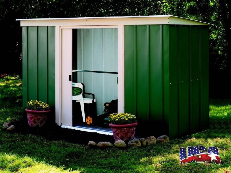 Menší plechový zahradní domek s pultovou střechou k uskladnění zahrádkářských, sportovních, bazénových, grilovacích, campingových, motoristických potřeb. Zahradní domky ARROW patří mezi nejrenomovanější značku zahradních domků na světových trzích.