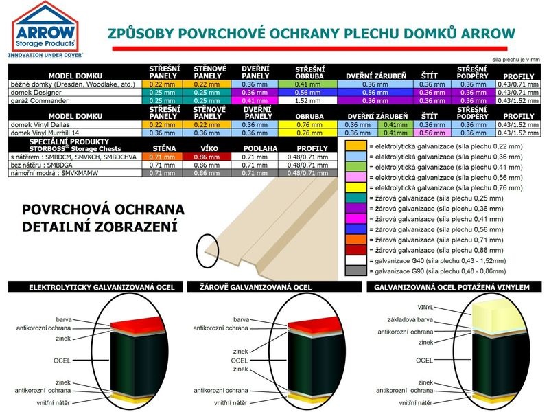 Kovový zahradní domek je vyrobený z pozinkovaného profilovaného plechu s vysokou pevností a se sílou stěny 0,22 – 0,35 mm. Střecha a části podlahové konstrukce jsou žárově pozinkovany, stěny a zbytek konstrukce prošly elektrolytickým zinkováním. Všechny nalakované díly jsou opatřeny kvalitní polyesterovou barvou.