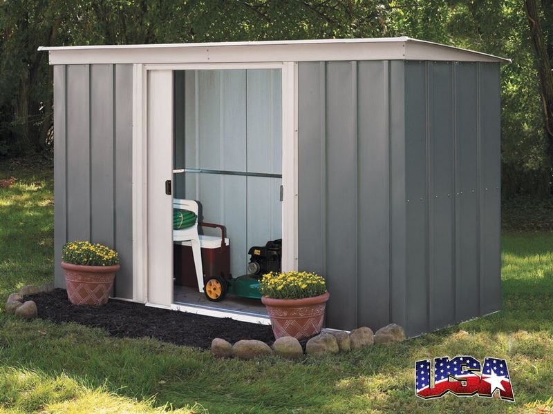 Menší plechový zahradní domek s pultovou střechou k uskladnění zahrádkářských, sportovních, bazénových, grilovacích, campingových, motoristických potřeb. Zahradní domky ARROW patří mezi nejrenomovanější značku zahradních domků na světových trzích.
