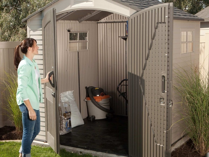Součástí dodávky je plastová protiskluzová podlaha, která chrání uložené vybavení před vlhkostí i nečistotami. Domek je vybaven dvoukřídlými dveřmi (138×192 cm) pro pohodlný vstup a manipulaci i s většími předměty.