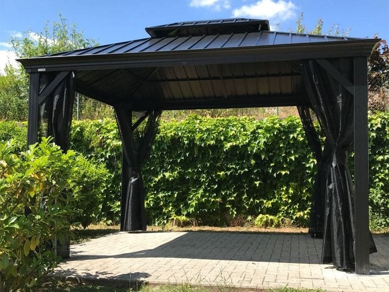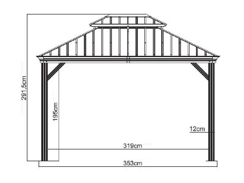 Střecha altánu je vyrobena z odolné oceli, která je vždy krásně tvarovaná. Zaručuje obzvláště vysokou stabilitu a snadno odolává povětrnostním podmínkám, jako je déšť, sníh nebo slunce (UV záření). Díky tomu je možné altán nechat na svém místě po celý rok. Součástí jsou také dešťové žlaby, které umožňují odtok dešťové vody.