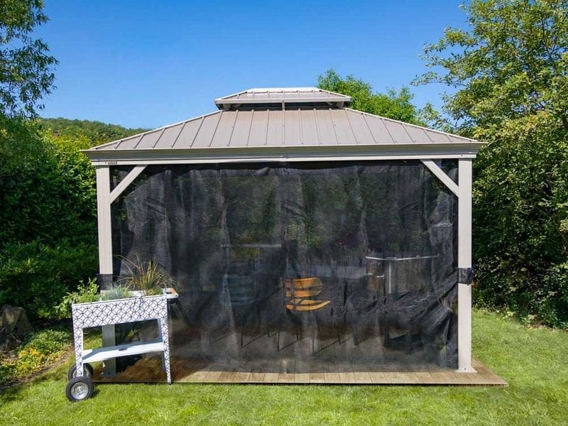 Součástí altánu jsou nylonové moskytiéry. Je možné dokoupit polyesterové závěsy. Oboje lze díky systému dvojitých kolejnic připevnit k sobě. Na rozdíl od jiných modelů se nejedná o jedno nebo druhé, ale moskytiéru i závěsy lze používat současně.