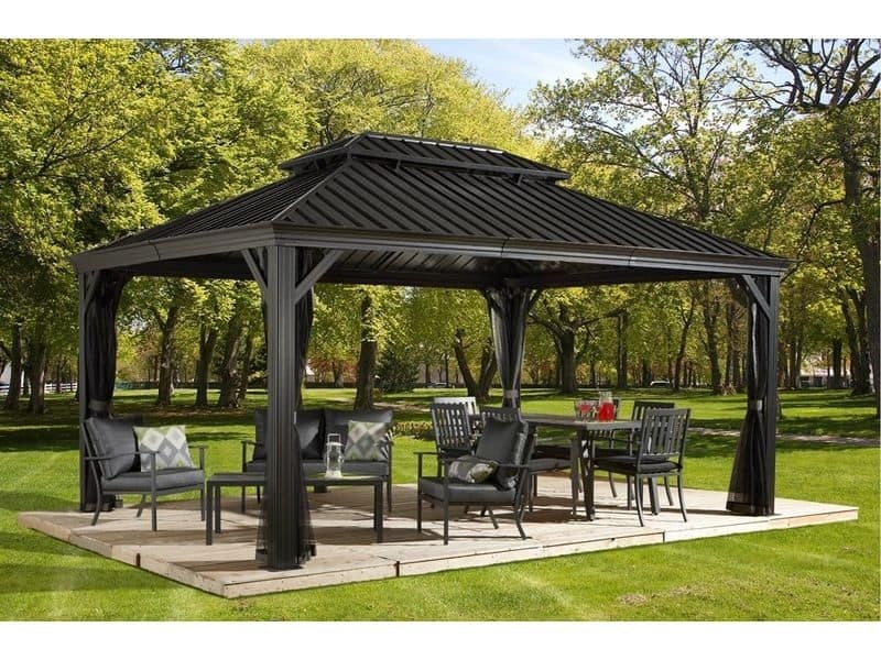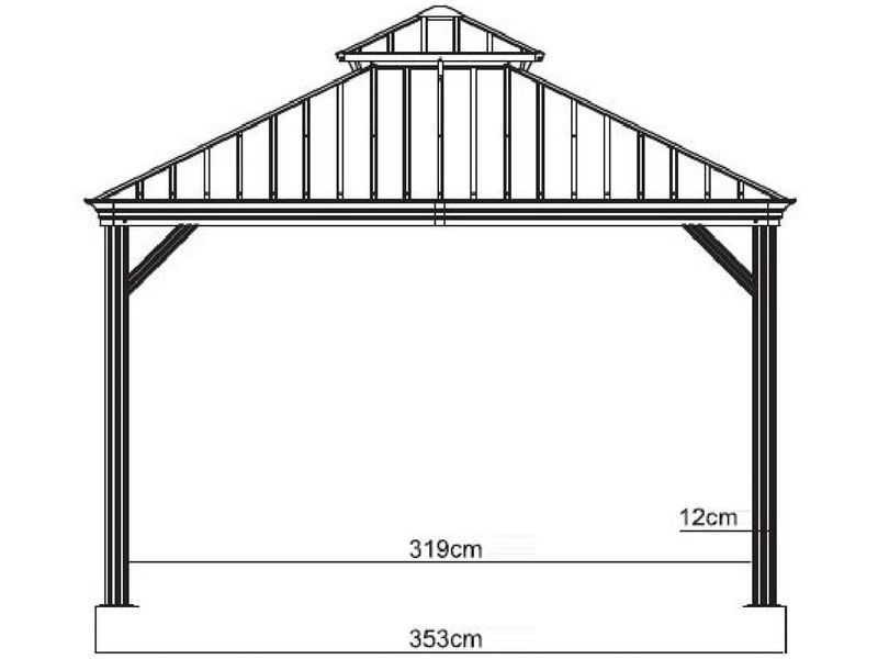 Střecha altánu je vyrobena z odolné oceli, která je vždy krásně tvarovaná. Zaručuje obzvláště vysokou stabilitu a snadno odolává povětrnostním podmínkám, jako je déšť, sníh nebo slunce (UV záření). Díky tomu je možné altán nechat na svém místě po celý rok. Součástí jsou také dešťové žlaby, které umožňují odtok dešťové vody.