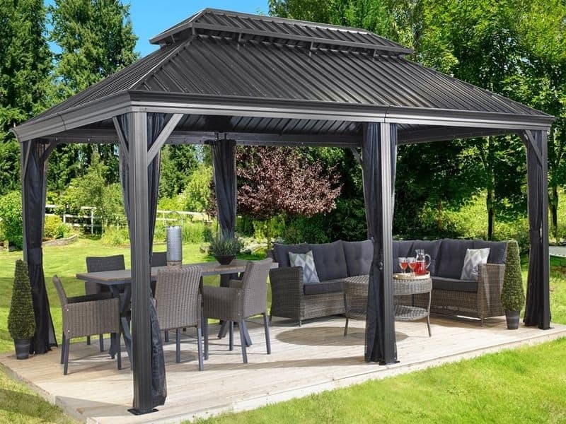 Střecha altánu je vyrobena z odolné oceli, která je vždy krásně tvarovaná. Zaručuje obzvláště vysokou stabilitu a snadno odolává povětrnostním podmínkám, jako je déšť, sníh nebo slunce (UV záření). Díky tomu je možné altán nechat na svém místě po celý rok. Součástí jsou také dešťové žlaby, které umožňují odtok dešťové vody.