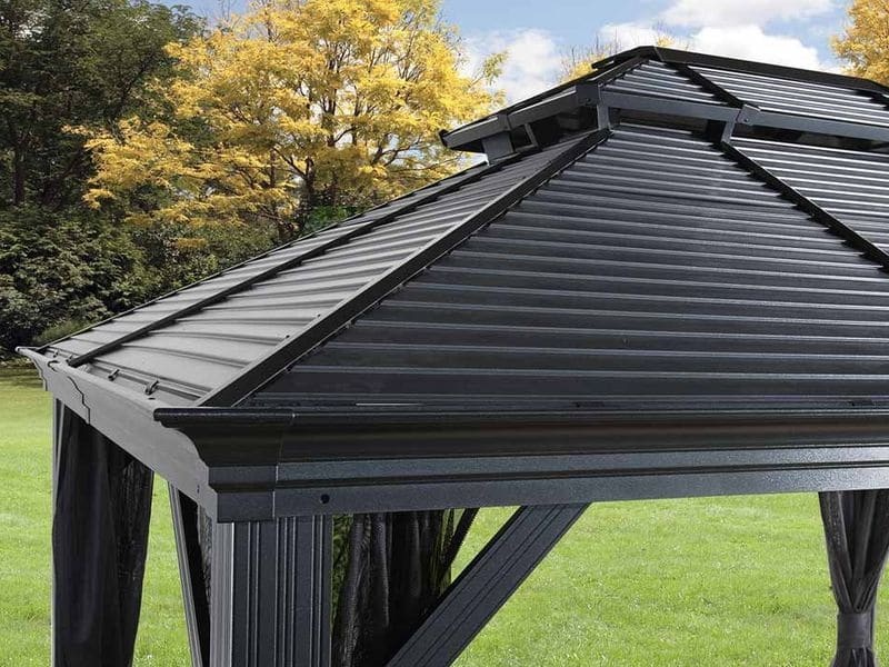 Střecha altánu je vyrobena z odolné oceli, která je vždy krásně tvarovaná. Zaručuje obzvláště vysokou stabilitu a snadno odolává povětrnostním podmínkám, jako je déšť, sníh nebo slunce (UV záření). Díky tomu je možné altán nechat na svém místě po celý rok. Součástí jsou také dešťové žlaby, které umožňují odtok dešťové vody.