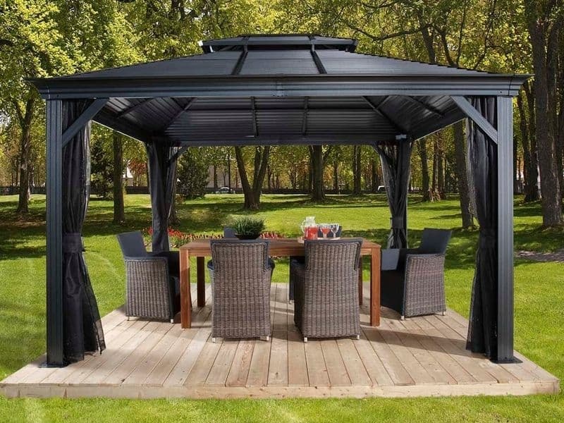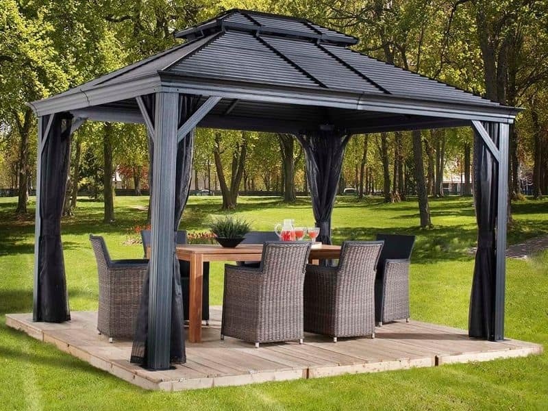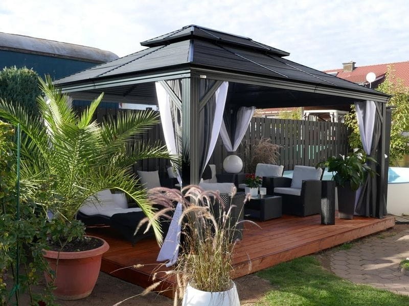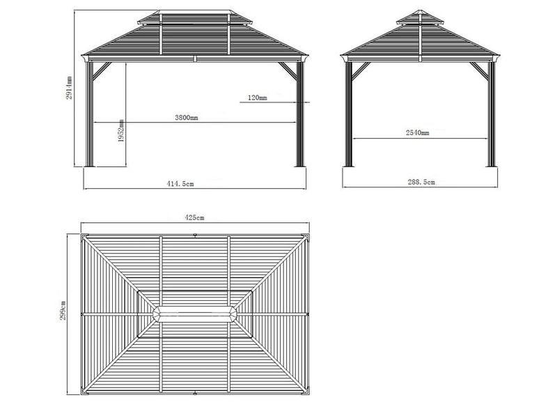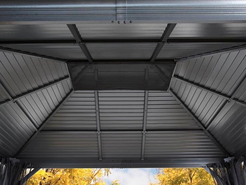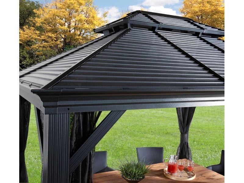 Střecha altánu je vyrobena z odolné oceli, která je vždy krásně tvarovaná. Zaručuje obzvláště vysokou stabilitu a snadno odolává povětrnostním podmínkám, jako je déšť, sníh nebo slunce (UV záření). Díky tomu je možné altán nechat na svém místě po celý rok. Součástí jsou také dešťové žlaby, které umožňují odtok dešťové vody.