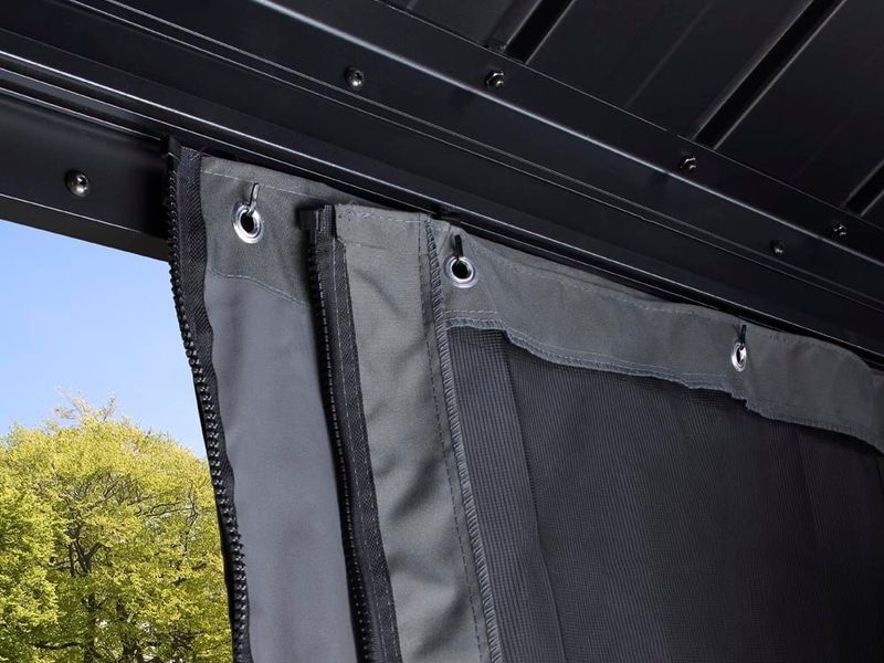 Součástí altánu jsou nylonové moskytiéry. Je možné dokoupit polyesterové závěsy. Oboje lze díky systému dvojitých kolejnic připevnit k sobě. Na rozdíl od jiných modelů se nejedná o jedno nebo druhé, ale moskytiéru i závěsy lze používat současně.