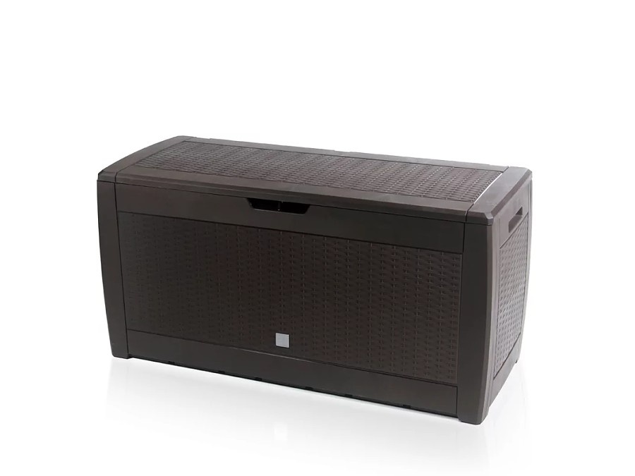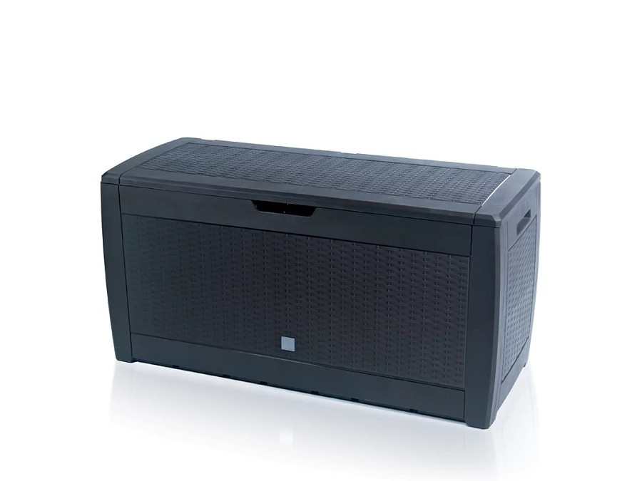 Úložný box na zahradu je vyrobený z plastu, který odolává běžným klimatickým vlivům. Součástí konstrukce je vestavěný držák pro visací zámek – plastový box jednoduše tak uzamknete a ochráníte uschované předměty.