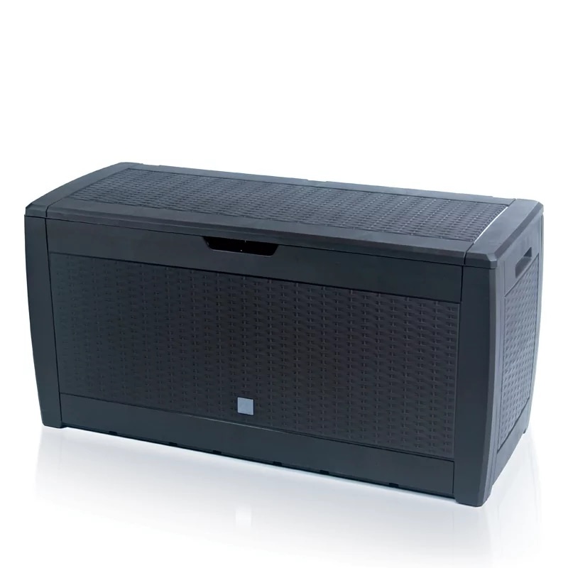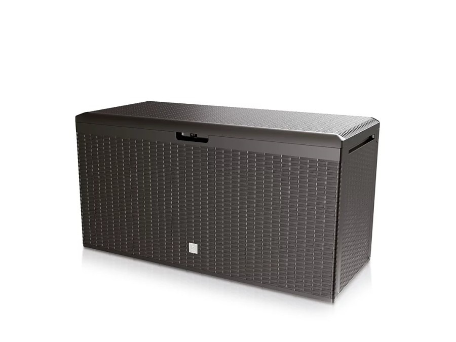 Úložný box na zahradu je vyrobený z plastu, který odolává běžným klimatickým vlivům. Součástí konstrukce je vestavěný držák pro visací zámek – plastový box jednoduše tak uzamknete a ochráníte uschované předměty.