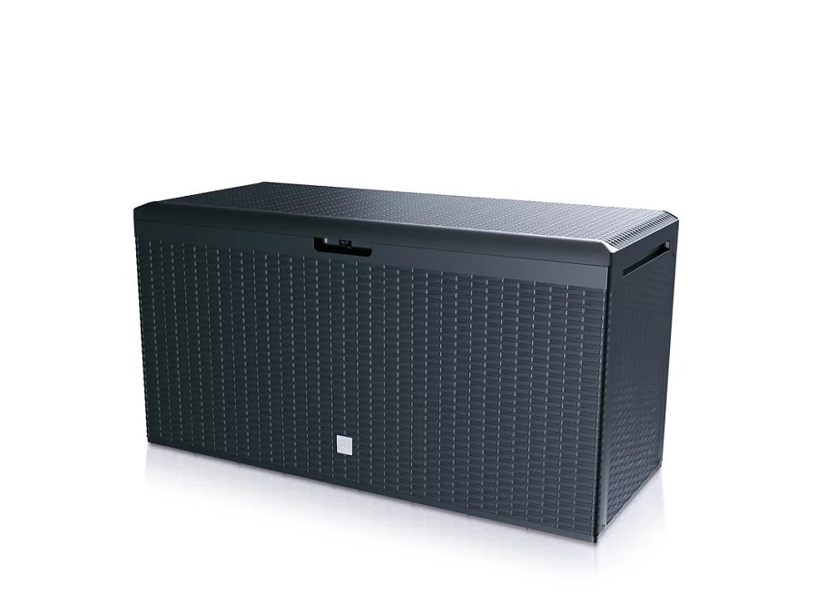 Úložný box na zahradu je vyrobený z plastu, který odolává běžným klimatickým vlivům. Součástí konstrukce je vestavěný držák pro visací zámek – plastový box jednoduše tak uzamknete a ochráníte uschované předměty.