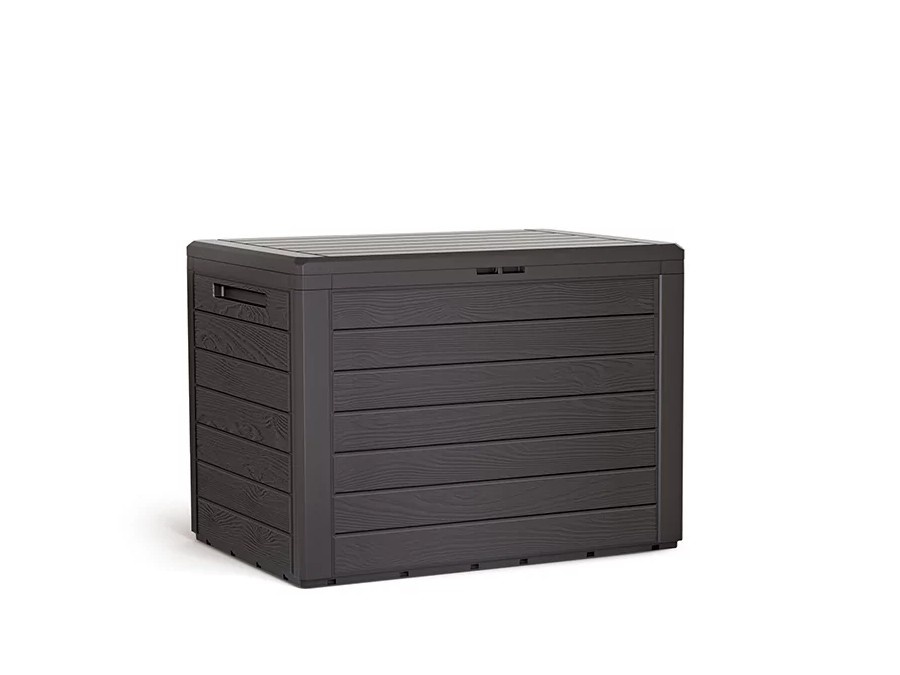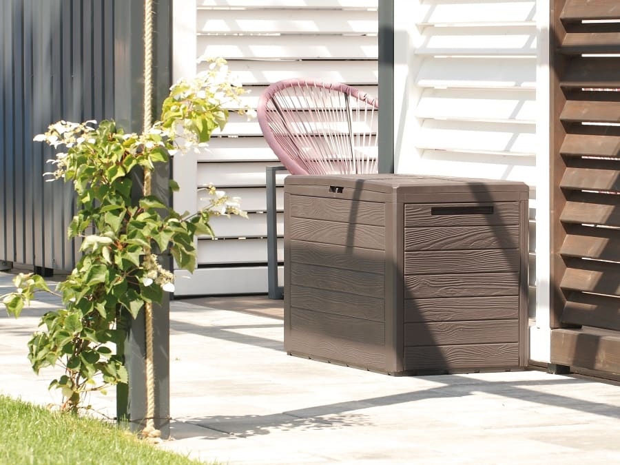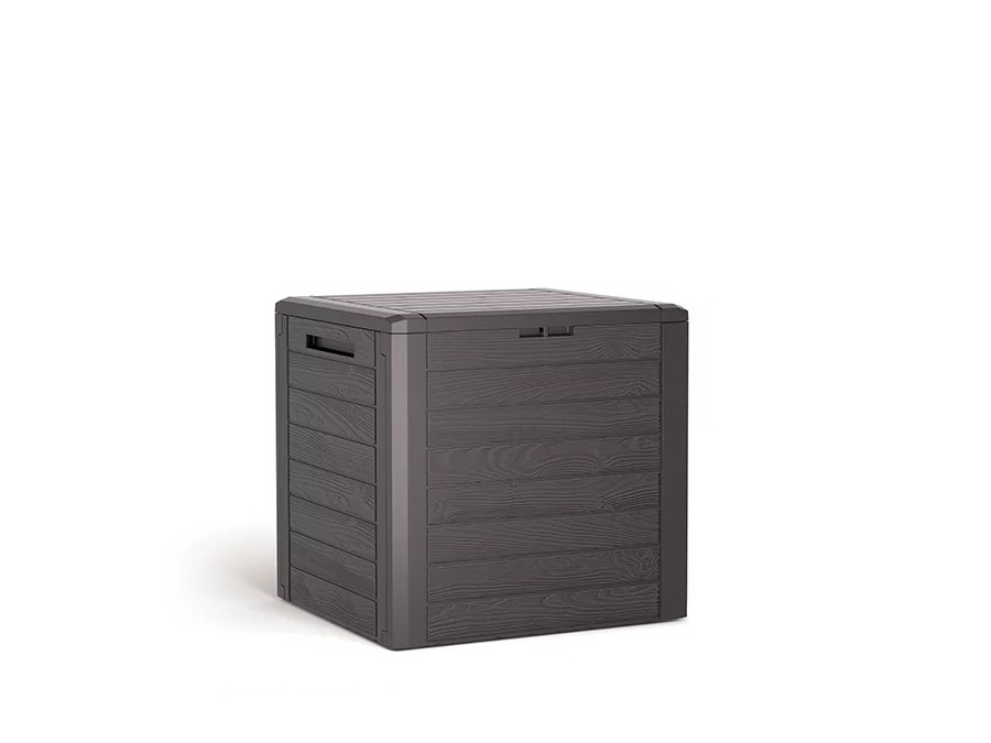 Úložný box představuje nejen funkční, ale také pohledový doplněk zahrady. Úložný boxu v imitaci dřeva působí na zahradě nenápadně a nenaruší estetický dojem z vašich venkovních prostor.